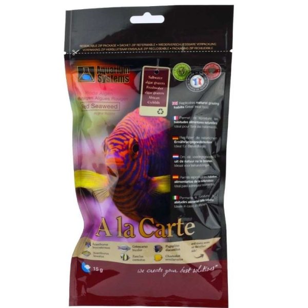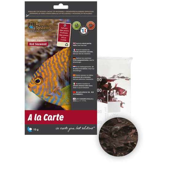جلبک دریایی قرمز آکواریوم سیستم La Carte یک جایگزین عالی برای سایر غذاهای مبتنی بر جلبک است. جلبک دریایی قرمز La Carte محتوای غذایی مورد نیاز گیاه خواران دریایی مانند: جراح ماهیان یا تانگ ها و فرشته ماهیان دریایی را ارائه می دهد و بنابراین باید جزء اصلی رژیم غذایی آنها در آکواریوم دریایی باشد.