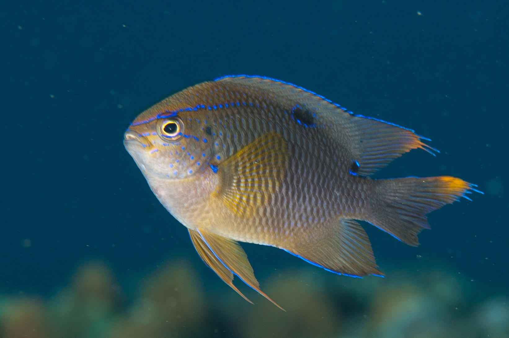 دامسل دم قرمز بالغ تیره با باله سینه ای زرد و رنگ زرد در اطراف دهان با حد اکثر 12 سانتی متر اندازه میباشند. زرد/نارنجی جوان با نشانه‌های آبی نئون، شبیه به تعدادی دیگر از دامسل ماهی‌های جوان. دو اوسل در پشت، اولين اوسلوس بزرگتر كه با خط آبي به پوزه به هم پيوسته و دومين اوسلوس كوچكتر در جايي كه باله پشتي به پايه دم مي پيوندد.