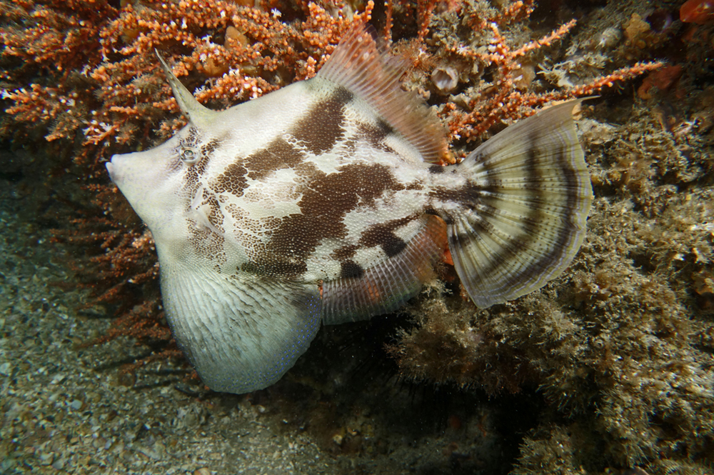 این ماهی همه چیز خوار – از جلبک ها، علف های دریایی و بی مهرگان کوچک مانند دوپایان، میگوهای کاریدین، غلاف ها، تانایدها، بریوزوآرها، هیدرووئیدها، کرم های چندشاخه و تونیکاتور تغذیه می کند. ملاحظات کت چرم Fanbelly می تواند در پاسخ به تغییرات زیستگاه تغییر رنگ دهد. جلبک سبز روشن، Caulerpa taxifolia، در خلیج مورتون فراوانتر میشود، و مطالعات نشان دادهاند که شکلهای کت چرمی قهوهای نوجوانان میتوانند به رنگ کلی مایل به سبز برای مطابقت با جلبک سبز روشن تغییر کنند.