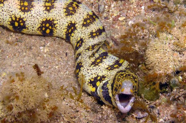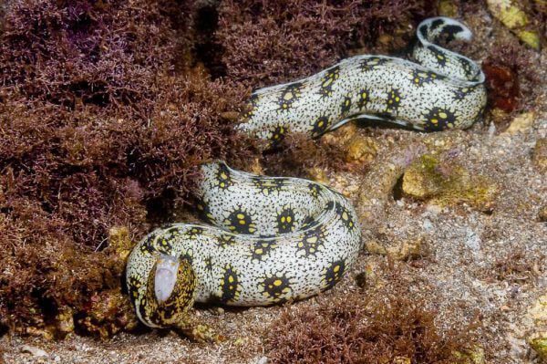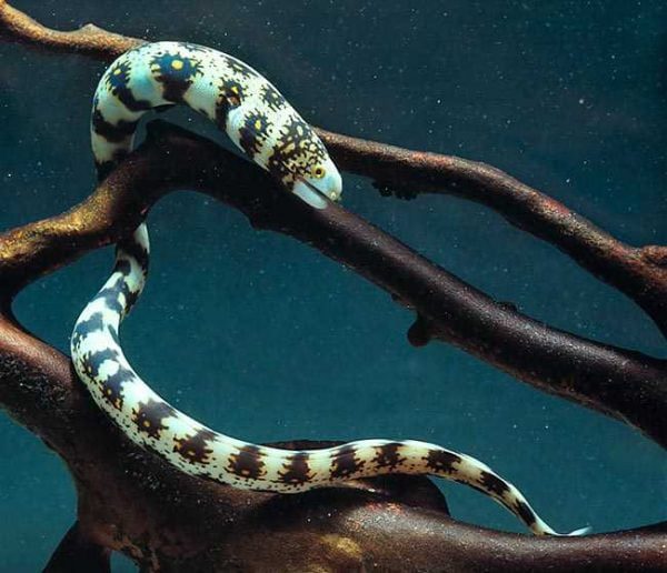 مار ماهی پولک برفی Snowflake Eel را می توان به راحتی با انواع ماهیان دریایی که بزرگ تر از دهان آن باشند، نگهداری کرد. همچنین می توان آن را با برخی از بی مهرگان دریایی، مانند؛ شقایق های دریایی و مرجان های دریایی نگهداری کرد، اما قابلیت نگهداری آن با سخت پوستان وجود ندارد و به آنان آسیب می ساند.