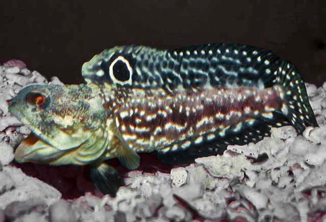 به طور کلی مایل به قهوه ای با 3-4 نوار طولی تیره در طرفین و لکه ها و لکه های سفید کشیده پراکنده که ظاهر راه راه های مواج شکسته را ایجاد می کند. باله پشتی سیاه، با خطوط سفید نامنظم و یک چشم برجسته در جلو، پشتی نرم با لکه های سفید. باله دم سیاه، با لکه های سفید؛ باله مقعدی سیاه، با یک ردیف لکه های سفید در امتداد پایه آن؛ بدون رنگ واضح در داخل دهان اندازه: حداقل به 12 سانتی متر می رسد. در کف های شن و ماسه ای ساکن است.